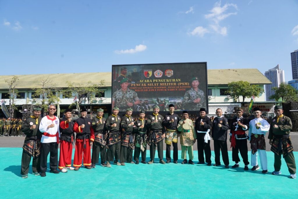 SURABAYA, Kamis 18 April 2026 – Kodam V/Brawijaya resmi mengukuhkan kepengurusan Pencak Silat Militer (PSM) tingkat provinsi hingga ranting sebagai langkah strategis memperkuat kemampuan bela diri prajurit. “PSM menjadi wadah pembinaan terarah dan berkelanjutan bagi prajurit profesional,” tegas Kadisjasad.